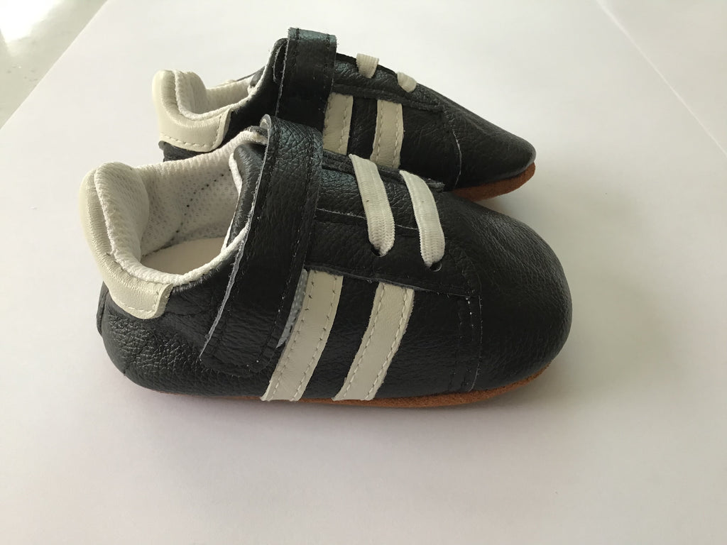 Gorgeous new little soft leather trainer style baby & toddler shoes. Kind to growing feet these shoes are made in the same way as the soft soles leather shoes but with an extra rubber sole so that outdoor play is easier. The non-slip rubber sole is also perfect for tiles and wooden floors. Light and comfortable toddlers love these little shoos.
